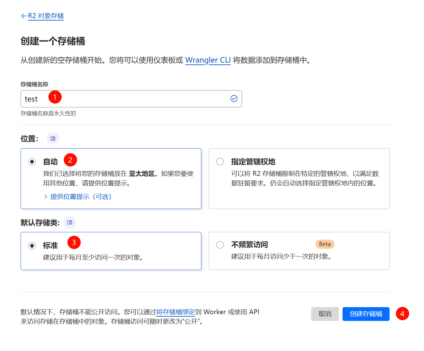 1.登录 Cloudflare 后,进入 R2 服务页面,点击 “创建存储桶”,填写相关信息,如存储桶名称,选择存放区域。