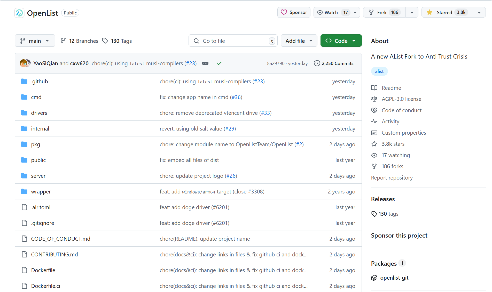 OpenList 是从 AList 分叉而来的开源项目,在 GitHub 上收获了超 3.8K 个星标,备受开发者和用户关注。