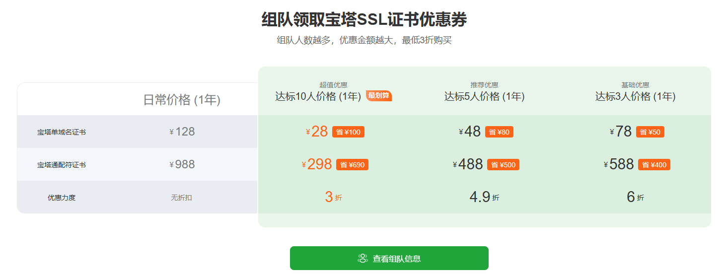 有需求或者爱折腾的可以组队领取宝塔SSL证书优惠券